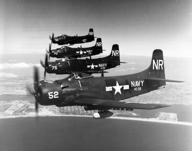 | Keywords: blackandwhite monochrome black and white Four AD-1 "Skyraiders" from VC-35 fly in formation over San Diego, 4 October 1950. Photo courtesy of the Naval Historical Center. Repository: San Diego Air and Space Museum Archive Four AD-1 "Skyraiders" from VC-35 fly in formation over San Diego, 4 October 1950. Photo courtesy of the Naval Historical Center. Repository: San Diego Air and Space Museum Archive | ||||