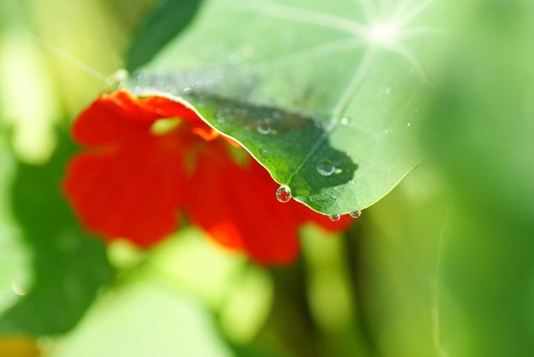 Keywords: nasturtium cress wassertrofpen mirror image blossom bloom red green close dew dewdrop rain tropical rain nature flower