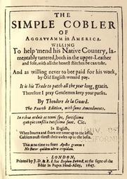Keywords: Nathaniel Ward, The Simple Cobler of Aggawam in America (4th ed, 1647, title page).jpg The title page of citation Theodore de la Guard pseudonym; w Nathaniel Ward The Simple Cobler of Aggavvamm in America Willing to Help 'Mend His Native Country Lamentably Tattered both in the Upper-leather and Sole with all the Honest Stitches He can Take And as Willing Never to bee Paid for His Work by Old English Wonted Pay It is His Trade to Patch all the Year Long Gratis Therefore I Pray Gentlemen Keep Your Purses 4th amended London Printed by John Dever Robert Ibbitson for Stephen Bowtell at the signe of the Bible in Popes Head-Alley 1647 228721940 https //archive org/stream/simplecoblerof00wardrich page/n8/mode/1up Internet Archive 1647 Nathaniel Ward 1578 “ October 1652 PD-old-100-1923 1647 books single pages Agawam Massachusetts Cobblers Title pages from England