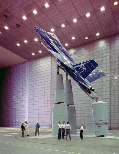 | Keywords: (AC91-0255-75): This photograph shows a McDonnell Douglas F/A-18 being installed in the National Full-Scale Tunnel Aerodynamics Complex’s 80- by 120-foot test section. Note how two movable floor sections allow the gantry crane to move completely inside through the large doors. (AC91-0255-75): This photograph shows a McDonnell Douglas F/A-18 being installed in the National Full-Scale Tunnel Aerodynamics Complex’s 80- by 120-foot test section. Note how two movable floor sections allow the gantry crane to move completely inside through the large doors. |