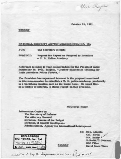 | Keywords: National Security Action Memorandum No. 106 Request for Report on Proposal to Establish a U.S. Police Academy - NARA - 193499.jpg Scope and content Memorandum for Secretary of State on establishing a United States police academy in Latin America General notes 193499 Local identifier President 1961-1963 Kennedy Office of the Special Assistant to the President for National Security Affairs 01/20/1961 - 11/22/1963 NARA-Author Bundy McGeorge 1919-1996 Author 1128212 <br /> John F Kennedy Library NLJFK Columbia Point Boston MA 02125-3398 1961-10-19 Record group Collection JFK-NSF Papers of President Kennedy National Security Files 01/20/1961 - 11/22/1963 Record group ARC 1164 National Security Files Meetings and Memoranda compiled 1961 - 1963 Series ARC 193354 File unit National Security Files Meetings and Memoranda National Security Action Memoranda 02/03/1961 - 11/13/1963 File unit ARC 193400 Variant control numbers NAIL Control Number NLK-NSF-MM-NSAM-10EEEI Other versions <gallery> File National_Security_Action_Memorandum_No _106_Request_for_Report_on_Proposal_to_Establish_a_U S _Police_Academy_-_NARA_-_193499 tif tif File National_Security_Action_Memorandum_No _106_Request_for_Report_on_Proposal_to_Establish_a_U S _Police_Academy_-_NARA_-_193499 jpg jpg </gallery> NARA-cooperation PD-USGov Check categories-NARA 2011 September 19 Presidential Decision Directives Kennedy |