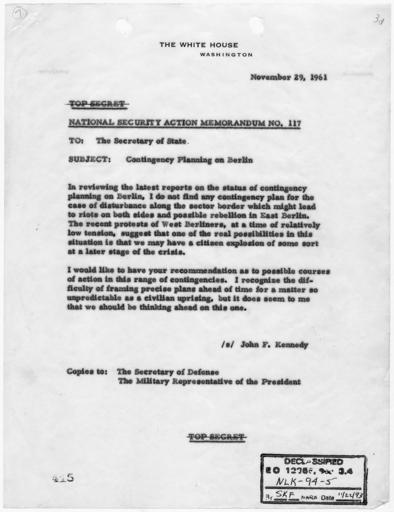 | Keywords: National Security Action Memorandum No. 117 Contingency Planning on Berlin - NARA - 193510.jpg Scope and content Memorandum for Secretary of State concerning contingency planning on Berlin General notes 193510 Local identifier President 1961-1963 Kennedy Office of the Special Assistant to the President for National Security Affairs 01/20/1961 - 11/22/1963 NARA-Author Kennedy John F John Fitzgerald 1917-1963 Author 1331563 <br /> John F Kennedy Library NLJFK Columbia Point Boston MA 02125-3398 1961-11-29 Record group Collection JFK-NSF Papers of President Kennedy National Security Files 01/20/1961 - 11/22/1963 Record group ARC 1164 National Security Files Meetings and Memoranda compiled 1961 - 1963 Series ARC 193354 File unit National Security Files Meetings and Memoranda National Security Action Memoranda 02/03/1961 - 11/13/1963 File unit ARC 193400 Variant control numbers NAIL Control Number NLK-NSF-MM-NSAM-10EEET Other versions <gallery> File National_Security_Action_Memorandum_No _117_Contingency_Planning_on_Berlin_-_NARA_-_193510 tif tif File National_Security_Action_Memorandum_No _117_Contingency_Planning_on_Berlin_-_NARA_-_193510 jpg jpg </gallery> NARA-cooperation PD-USGov Check categories-NARA 2011 September 19 Presidential Decision Directives Kennedy |