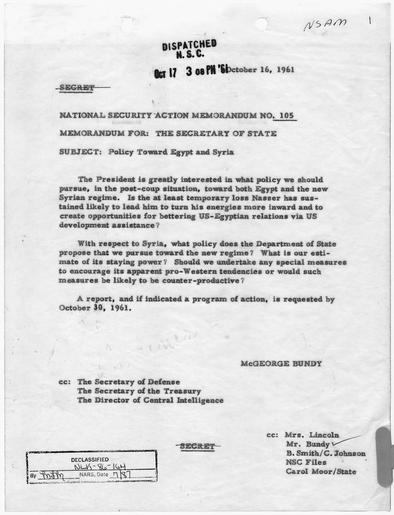 | Keywords: National Security Action Memorandum No. 105 Policy Toward Egypt and Syria - NARA - 193498.tif Scope and content Memorandum for Secretary of State on U S policy towards Egypt and Syria General notes 193498 Local identifier President 1961-1963 Kennedy Office of the Special Assistant to the President for National Security Affairs 01/20/1961 - 11/22/1963 NARA-Author Bundy McGeorge 1919-1996 Author 1128212 <br /> John F Kennedy Library NLJFK Columbia Point Boston MA 02125-3398 1961-10-16 Record group Collection JFK-NSF Papers of President Kennedy National Security Files 01/20/1961 - 11/22/1963 Record group ARC 1164 National Security Files Meetings and Memoranda compiled 1961 - 1963 Series ARC 193354 File unit National Security Files Meetings and Memoranda National Security Action Memoranda 02/03/1961 - 11/13/1963 File unit ARC 193400 Variant control numbers NAIL Control Number NLK-NSF-MM-NSAM-10EEEH yes Other versions <gallery> File National_Security_Action_Memorandum_No _105_Policy_Toward_Egypt_and_Syria_-_NARA_-_193498 tif tif File National_Security_Action_Memorandum_No _105_Policy_Toward_Egypt_and_Syria_-_NARA_-_193498 jpg jpg </gallery> NARA-cooperation PD-USGov Presidential Decision Directives Kennedy NARA TIF images with categorized JPGs 1961 in Egypt United Arab Republic Gamal Abdel Nasser |