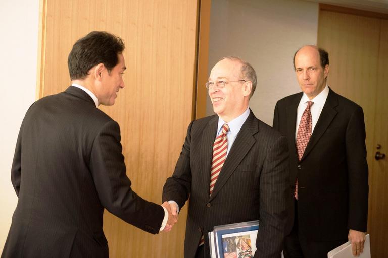 | Keywords: National Security Council Senior Director and Ambassador Roos Are Greeted By Japanese Foreign Minister Kishida.jpg en National Security Council Senior Director for Asian Affairs Daniel Russel and U S Ambassador to Japan John V Roos are greeted by Japanese Foreign Minister Fumio Kishida before their meeting at the Ministry of Foreign Affairs in Tokyo Japan January 17 2013 State Department photo by William Ng/ Public Domain 2013-02-04 18 50 28 http //www flickr com/photos/statephotos/8389394261/sizes/o/in/photostream/ U S Department of State U S Department of State http //flickr com/photos/9364837 N06/8389394261 2013-02-04 13 51 34 United States Government Work PD-USGov Daniel R Russel John Roos in 2013 Fumio Kishida in 2013 Uploaded with UploadWizard |