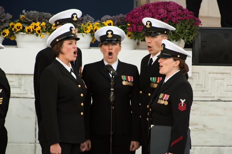 | Keywords: #everydayveteransday #usnavyveterans #couragetoserve #veteransda everydayveteransdayusnavyveteranscouragetoserveveteransda #everydayveteransday #usnavyveterans #couragetoserve #veteransday everydayveteransdayusnavyveteranscouragetoserveveteransday 161111-N-HG258-064 ARLINGTON, VA (November 11, 2016) Vocalists from the U.S. Navy Band Sea Chanters chorus, from left to right, petty officers 1st class Kristin Pagent, Adam Whitman, Maia Rodriquez and Bill Edwards, and chief petty officer Casey Campbell sing "God Bless America" during the National Veterans Day Observance at Arlington National Cemetery. The U.S. Navy Ceremonial band and Sea Chanters chorus participated in the national ovservance at the Memorial Ampetheater at Arlington National Cemetery honoring the men and women who have served and continue to serve in the U.S. armed forces during war and peacetime. (U.S. Navy photo by Senior Chief Petty Officer Stephen Hassay/released) 161111-N-HG258-064 ARLINGTON, VA (November 11, 2016) Vocalists from the U.S. Navy Band Sea Chanters chorus, from left to right, petty officers 1st class Kristin Pagent, Adam Whitman, Maia Rodriquez and Bill Edwards, and chief petty officer Casey Campbell sing "God Bless America" during the National Veterans Day Observance at Arlington National Cemetery. The U.S. Navy Ceremonial band and Sea Chanters chorus participated in the national ovservance at the Memorial Ampetheater at Arlington National Cemetery honoring the men and women who have served and continue to serve in the U.S. armed forces during war and peacetime. (U.S. Navy photo by Senior Chief Petty Officer Stephen Hassay/released) |