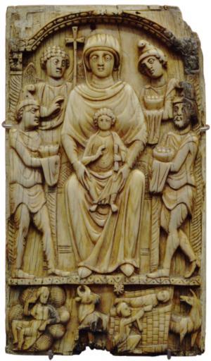 | Keywords: Nativity and Magi Byzantine ivory.png Panel with the Nativity and the Adoration of the Magi Holy Land first half of the 6th century AD<br> From a monastery in Thessaly where it was framed as an icon<br> The panel probably once part of a large diptych leaf shows the Virgin and infant Christ attended by the three Magi wise men and an angel Below the Virgin reclines on a mattress while the Child lies in the manger between the ox and the ass with the Star of Bethlehem above <br>In front of the manger a kneeling woman holds out her withered hand towards the infant Christ The legend of Salome who had her hand withered for doubting Mary's virginity is told in the apocryphal Gospel of James The story was later applied to a midwife <br> On the back of the panel is a prayer written in a 12th century Greek hand Height 21 7 cm in on Width 12 4 cm in on Depth 1 2 cm in on Room 41 Museum British Museum Author Richardprins Byzantine ivory Room 41 British Museum Reliefs of the Adoration of the Magi Reliefs of the nativity of Jesus Christ Icons of the nativity of Jesus Christ Kneeling in prayer in art |