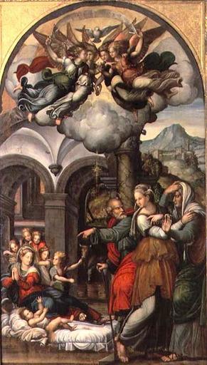 | Keywords: 'Nativity with the Two Midwives', oil on canvas painting by Pellegrino Aretusi, Estense Gallery, Modena, Italy.jpg  Nativity with the Two Midwives Galleria Estense Modena Italy ca 1500 oil canvas creator Pellegrino Aretusi cm institution Galleria Estense Modena object history exhibition history credit line accession number PD-old-100-1923 Paintings in the Galleria estense Modena Pellegrino Aretusi 1500s paintings in Italy Renaissance paintings in Modena Paintings of the nativity of Jesus Christ in Italy Modena Midwives in art Angels in the air Angels with banners 16th-century oil on canvas paintings in Italy Pointing right in art 16th-century paintings of the nativity of Jesus Christ Angels on clouds Paintings of angels in Italy |