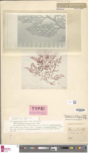 | Keywords: Naturalis Biodiversity Center - L.4040557 - Ceramium planum Kütz. - Rhodophyceae - Plant type specimen.jpeg Author artwork Author publication Basis of record Herbarium sheet Catalog number L 4040557 Collection code L Collection date artwork Dimensions artwork Document type Rhodophyceae Ceramium Hommersand MH Individual count Infraspecific epithet Infraspecific rank Institution Naturalis Kind of unit artwork Kind of unit specimen Life stage CBS Tafelbay Medium artwork Nomenclatural code Occurrence ID page Other fields Other versions artwork Permission license Naturalis donation CC0 Publication location Scientific name Pteroceras flexuosum Kütz type of - Ceramium planum Kütz species Scientific name authorship Kütz Source url http //bioportal naturalis nl Specific epithet planum State or province Cape Tafelbaai Subject keywords artwork Subject keywords publication Title artwork Title publication Type status type 0-0-1979 dmy Uploaded with GWToolset Naturalis_Biodiversity_Center_-_L 4040557_-_Ceramium_planum_Kütz _-_Rhodophyceae_-_Plant_type_specimen http //medialib naturalis nl/file/id/L 4040557/format/large Media donated by Naturalis Biodiversity Center Plant type specimens at Naturalis Biodiversity Center Ceramium planum Ceramium |