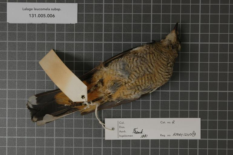 | Keywords: Naturalis Biodiversity Center - RMNH.AVES.124089 2 - Lalage leucomela subsp. - Campephagidae - bird skin specimen.jpeg artwork Dimensions artwork Document type Campephagidae Lalage Individual count 1 Infraspecific epithet subsp Infraspecific rank Institution Naturalis Kind of unit artwork Kind of unit specimen skin Life stage Australiƫ Cap York Medium artwork Nomenclatural code Occurrence ID page Other fields Other versions artwork Permission license Naturalis donation CC-0 Publication location Scientific name Lalage leucomela subsp Scientific name authorship Source url http //bioportal naturalis nl Specific epithet leucomela State or province Cap York Subject keywords artwork Subject keywords publication Title artwork Title publication Type status Uploaded with GWToolset Naturalis_Biodiversity_Center_-_RMNH AVES 124089_2_-_Lalage_leucomela_subsp _-_Campephagidae_-_bird_skin_specimen http //medialib naturalis nl/file/id/RMNH AVES 124089_2/format/large Media donated by Naturalis Biodiversity Center Songbird specimens at Naturalis Biodiversity Center Lalage leucomela subsp |