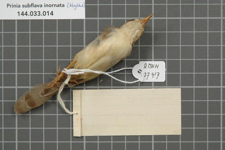 Keywords: Naturalis Biodiversity Center - RMNH.AVES.137417 2 - Prinia subflava inornata Sykes, 1832 - Sylviidae - bird skin specimen.jpeg artwork Dimensions artwork Document type Sylviidae Prinia Individual count 1 Infraspecific epithet inornata Infraspecific rank Institution Naturalis Kind of unit artwork Kind of unit specimen skin Life stage adult Indonesia Java Surabaja Medium artwork Nomenclatural code Additional identification info ohne Namen Occurrence ID page Other fields Other versions artwork Permission license Naturalis donation CC-0 Publication location Scientific name Prinia subflava inornata Sykes 1832 Scientific name authorship Sykes 1832 Source url http //bioportal naturalis nl Specific epithet subflava State or province Subject keywords artwork Subject keywords publication Title artwork Title publication Type status Uploaded with GWToolset Naturalis_Biodiversity_Center_-_RMNH AVES 137417_2_-_Prinia_subflava_inornata_Sykes _1832_-_Sylviidae_-_bird_skin_specimen http //medialib naturalis nl/file/id/RMNH AVES 137417_2/format/large Media donated by Naturalis Biodiversity Center Songbird specimens at Naturalis Biodiversity Center Prinia subflava Prinia
