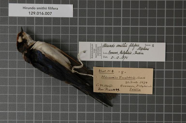 Keywords: Naturalis Biodiversity Center - RMNH.AVES.125103 1 - Hirundo smithii filifera Stephens, 1825 - Hirundinidae - bird skin specimen.jpeg artwork Dimensions artwork Document type Hirundinidae Hirundo Individual count 1 Infraspecific epithet filifera Infraspecific rank Institution Naturalis Kind of unit artwork Kind of unit specimen skin Life stage India Nilghiris Coonoor Medium artwork Nomenclatural code Sex remark female Occurrence ID page Other fields Other versions artwork Permission license Naturalis donation CC-0 Publication location Scientific name Hirundo smithii filifera Stephens 1825 Scientific name authorship Stephens 1825 female Source url http //bioportal naturalis nl Specific epithet smithii State or province Nilghiris Subject keywords artwork Subject keywords publication Title artwork Title publication Type status Uploaded with GWToolset Naturalis_Biodiversity_Center_-_RMNH AVES 125103_1_-_Hirundo_smithii_filifera_Stephens _1825_-_Hirundinidae_-_bird_skin_specimen http //medialib naturalis nl/file/id/RMNH AVES 125103_1/format/large Media donated by Naturalis Biodiversity Center Songbird specimens at Naturalis Biodiversity Center Hirundo smithii museum specimens
