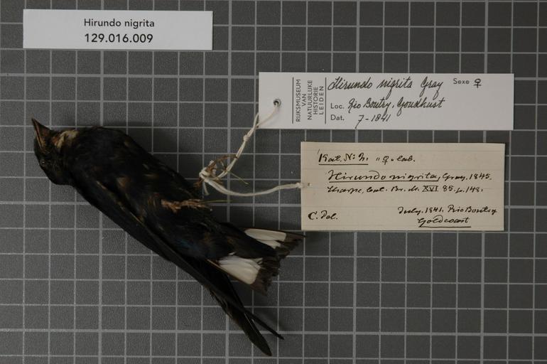 | Keywords: Naturalis Biodiversity Center - RMNH.AVES.125106 1 - Hirundo nigrita Gray, 1844 - Hirundinidae - bird skin specimen.jpeg artwork Dimensions artwork Document type Hirundinidae Hirundo Individual count 1 Infraspecific epithet Infraspecific rank Institution Naturalis Kind of unit artwork Kind of unit specimen skin Life stage Goudkust Rio Boutry Medium artwork Nomenclatural code Additional label info Hirundo spec old label by temm später H nigrita Gray Sex remark female lab Occurrence ID page Other fields Other versions artwork Permission license Naturalis donation CC-0 Publication location Scientific name Hirundo nigrita Gray 1844 Scientific name authorship Gray 1844 female Source url http //bioportal naturalis nl Specific epithet nigrita State or province Subject keywords artwork Subject keywords publication Title artwork Title publication Type status Uploaded with GWToolset Naturalis_Biodiversity_Center_-_RMNH AVES 125106_1_-_Hirundo_nigrita_Gray _1844_-_Hirundinidae_-_bird_skin_specimen http //medialib naturalis nl/file/id/RMNH AVES 125106_1/format/large Media donated by Naturalis Biodiversity Center Songbird specimens at Naturalis Biodiversity Center Hirundo nigrita museum specimens |