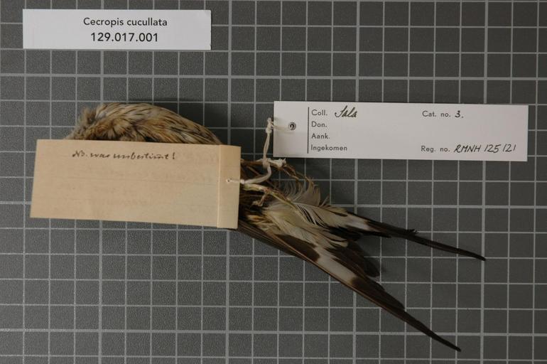 | Keywords: Naturalis Biodiversity Center - RMNH.AVES.125121 2 - Cecropis cucullata (Boddaert, 1783) - Hirundinidae - bird skin specimen.jpeg artwork Dimensions artwork Document type Hirundinidae Cecropis Individual count 1 Infraspecific epithet Infraspecific rank Institution Naturalis Kind of unit artwork Kind of unit specimen skin Life stage Z W Afrika Mossamedes Medium artwork Nomenclatural code Additional identification info NB War unbestimmt Sex remark male Coll Occurrence ID page Other fields Other versions artwork Permission license Naturalis donation CC-0 Publication location Scientific name Cecropis cucullata Boddaert 1783 Scientific name authorship Boddaert 1783 male Source url http //bioportal naturalis nl Specific epithet cucullata State or province Subject keywords artwork Subject keywords publication Title artwork Title publication Type status Uploaded with GWToolset Naturalis_Biodiversity_Center_-_RMNH AVES 125121_2_-_Cecropis_cucullata_ Boddaert _1783 _-_Hirundinidae_-_bird_skin_specimen http //medialib naturalis nl/file/id/RMNH AVES 125121_2/format/large Media donated by Naturalis Biodiversity Center Songbird specimens at Naturalis Biodiversity Center Cecropis cucullata museum specimens |