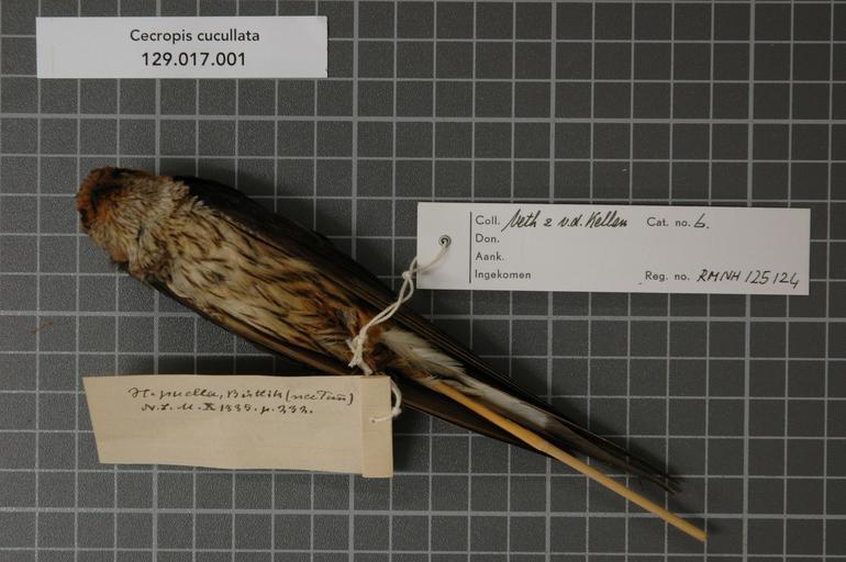 | Keywords: Naturalis Biodiversity Center - RMNH.AVES.125124 2 - Cecropis cucullata (Boddaert, 1783) - Hirundinidae - bird skin specimen.jpeg artwork Dimensions artwork Document type Hirundinidae Cecropis Individual count 1 Infraspecific epithet Infraspecific rank Institution Naturalis Kind of unit artwork Kind of unit specimen skin Life stage Z W Afrika Cunené Humpata Medium artwork Nomenclatural code Sex remark female Occurrence ID page Other fields Other versions artwork Permission license Naturalis donation CC-0 Publication location Scientific name Cecropis cucullata Boddaert 1783 Scientific name authorship Boddaert 1783 female Source url http //bioportal naturalis nl Specific epithet cucullata State or province Cunené Subject keywords artwork Subject keywords publication Title artwork Title publication Type status Uploaded with GWToolset Naturalis_Biodiversity_Center_-_RMNH AVES 125124_2_-_Cecropis_cucullata_ Boddaert _1783 _-_Hirundinidae_-_bird_skin_specimen http //medialib naturalis nl/file/id/RMNH AVES 125124_2/format/large Media donated by Naturalis Biodiversity Center Songbird specimens at Naturalis Biodiversity Center Cecropis cucullata museum specimens |