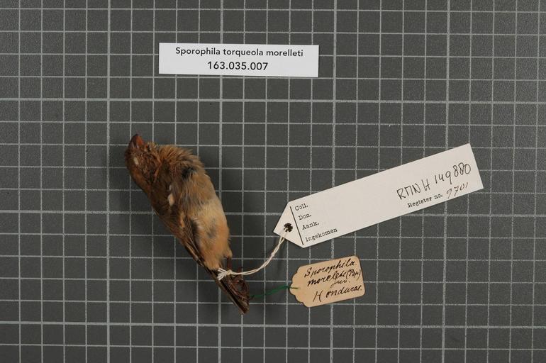 Keywords: Naturalis Biodiversity Center - RMNH.AVES.149880 1 - Presrophila torqueola morelleti (Bonaparte, 1851) - Emberizidae - bird skin specimen.jpeg artwork Dimensions artwork Document type Emberizidae Sporophila Individual count 1 Infraspecific epithet morelleti Infraspecific rank Institution Naturalis Kind of unit artwork Kind of unit specimen skin Life stage juvenile Honduras Medium artwork Nomenclatural code Occurrence ID page Other fields Other versions artwork Permission license Naturalis donation CC-0 Publication location Scientific name Presrophila torqueola morelleti Bonaparte 1851 Scientific name authorship Bonaparte 1851 Source url http //bioportal naturalis nl Specific epithet torqueola State or province Subject keywords artwork Subject keywords publication Title artwork Title publication Type status Uploaded with GWToolset Naturalis_Biodiversity_Center_-_RMNH AVES 149880_1_-_Presrophila_torqueola_morelleti_ Bonaparte _1851 _-_Emberizidae_-_bird_skin_specimen http //medialib naturalis nl/file/id/RMNH AVES 149880_1/format/large Media donated by Naturalis Biodiversity Center Songbird specimens at Naturalis Biodiversity Center Sporophila Sporophila torqueola