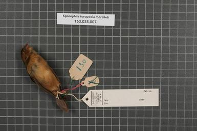 Keywords: Naturalis Biodiversity Center - RMNH.AVES.149885 2 - Presrophila torqueola morelleti (Bonaparte, 1851) - Emberizidae - bird skin specimen.jpeg artwork Dimensions artwork Document type Emberizidae Sporophila Individual count 1 Infraspecific epithet morelleti Infraspecific rank Institution Naturalis Kind of unit artwork Kind of unit specimen skin Life stage juvenile Honduras Chamelicon Medium artwork Nomenclatural code Occurrence ID page Other fields Other versions artwork Permission license Naturalis donation CC-0 Publication location Scientific name Presrophila torqueola morelleti Bonaparte 1851 Scientific name authorship Bonaparte 1851 male Source url http //bioportal naturalis nl Specific epithet torqueola State or province Subject keywords artwork Subject keywords publication Title artwork Title publication Type status Uploaded with GWToolset Naturalis_Biodiversity_Center_-_RMNH AVES 149885_2_-_Presrophila_torqueola_morelleti_ Bonaparte _1851 _-_Emberizidae_-_bird_skin_specimen http //medialib naturalis nl/file/id/RMNH AVES 149885_2/format/large Media donated by Naturalis Biodiversity Center Songbird specimens at Naturalis Biodiversity Center Sporophila Sporophila torqueola