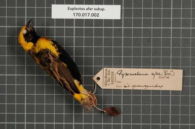 | Keywords: Naturalis Biodiversity Center - RMNH.AVES.151579 1 - Euplectes afer subsp. - Ploceidae - bird skin specimen.jpeg artwork Dimensions artwork Document type Ploceidae Euplectes Individual count 1 Infraspecific epithet subsp Infraspecific rank Institution Naturalis Kind of unit artwork Kind of unit specimen skin Life stage Medium artwork Nomenclatural code Occurrence ID page Other fields Other versions artwork Permission license Naturalis donation CC-0 Publication location Scientific name Euplectes afer subsp Scientific name authorship male Source url http //bioportal naturalis nl Specific epithet afer State or province Subject keywords artwork Subject keywords publication Title artwork Title publication Type status Uploaded with GWToolset Naturalis_Biodiversity_Center_-_RMNH AVES 151579_1_-_Euplectes_afer_subsp _-_Ploceidae_-_bird_skin_specimen http //medialib naturalis nl/file/id/RMNH AVES 151579_1/format/large Media donated by Naturalis Biodiversity Center Songbird specimens at Naturalis Biodiversity Center Euplectes afer Euplectes |