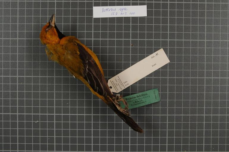 Keywords: Naturalis Biodiversity Center - RMNH.AVES.153440 1 - Icterus spec. - Icteridae - bird skin specimen.jpeg artwork Dimensions artwork Document type Icteridae Icterus Individual count 1 Infraspecific epithet Infraspecific rank Institution Naturalis Kind of unit artwork Kind of unit specimen skin Life stage Venezuela Medium artwork Nomenclatural code Occurrence ID page Other fields Other versions artwork Permission license Naturalis donation CC-0 Publication location Scientific name Icterus spec Scientific name authorship male Source url http //bioportal naturalis nl Specific epithet spec State or province Subject keywords artwork Subject keywords publication Title artwork Title publication Type status Uploaded with GWToolset Naturalis_Biodiversity_Center_-_RMNH AVES 153440_1_-_Icterus_spec _-_Icteridae_-_bird_skin_specimen http //medialib naturalis nl/file/id/RMNH AVES 153440_1/format/large Media donated by Naturalis Biodiversity Center Songbird specimens at Naturalis Biodiversity Center Icterus Icterus |