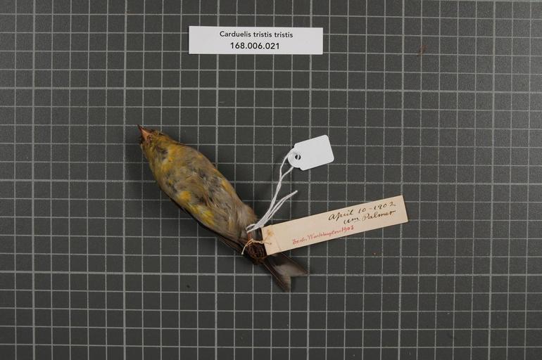 | Keywords: Naturalis Biodiversity Center - RMNH.AVES.154020 2 - Carduelis tristis tristis (Linnaeus, 1758) - Fringillidae - bird skin specimen.jpeg artwork Dimensions artwork Document type Fringillidae Carduelis Individual count 1 Infraspecific epithet tristis Infraspecific rank Institution Naturalis Kind of unit artwork Kind of unit specimen skin Life stage Maryland Montgomery Co Cabin John Medium artwork Nomenclatural code Occurrence ID page Other fields Other versions artwork Permission license Naturalis donation CC-0 Publication location Scientific name Carduelis tristis tristis Linnaeus 1758 Scientific name authorship Linnaeus 1758 male Source url http //bioportal naturalis nl Specific epithet tristis State or province Maryland Montgomery Co Subject keywords artwork Subject keywords publication Title artwork Title publication Type status Uploaded with GWToolset Naturalis_Biodiversity_Center_-_RMNH AVES 154020_2_-_Carduelis_tristis_tristis_ Linnaeus _1758 _-_Fringillidae_-_bird_skin_specimen http //medialib naturalis nl/file/id/RMNH AVES 154020_2/format/large Media donated by Naturalis Biodiversity Center Songbird specimens at Naturalis Biodiversity Center Spinus tristis Carduelis |