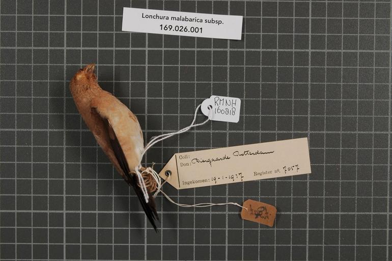 | Keywords: Naturalis Biodiversity Center - RMNH.AVES.160818 1 - Lonchura malabarica cantans (Gmelin, 1789) - Estrildidae - bird skin specimen.jpeg artwork Dimensions artwork Document type Estrildidae Lonchura Individual count 1 Infraspecific epithet cantans Infraspecific rank Institution Naturalis Kind of unit artwork Kind of unit specimen skin Life stage Medium artwork Nomenclatural code Occurrence ID page Other fields Other versions artwork Permission license Naturalis donation CC-0 Publication location Scientific name Lonchura malabarica cantans Gmelin 1789 Scientific name authorship Gmelin 1789 female Source url http //bioportal naturalis nl Specific epithet malabarica State or province Subject keywords artwork Subject keywords publication Title artwork Title publication Type status Uploaded with GWToolset Naturalis_Biodiversity_Center_-_RMNH AVES 160818_1_-_Lonchura_malabarica_cantans_ Gmelin _1789 _-_Estrildidae_-_bird_skin_specimen http //medialib naturalis nl/file/id/RMNH AVES 160818_1/format/large Media donated by Naturalis Biodiversity Center Songbird specimens at Naturalis Biodiversity Center Euodice malabarica Lonchura |