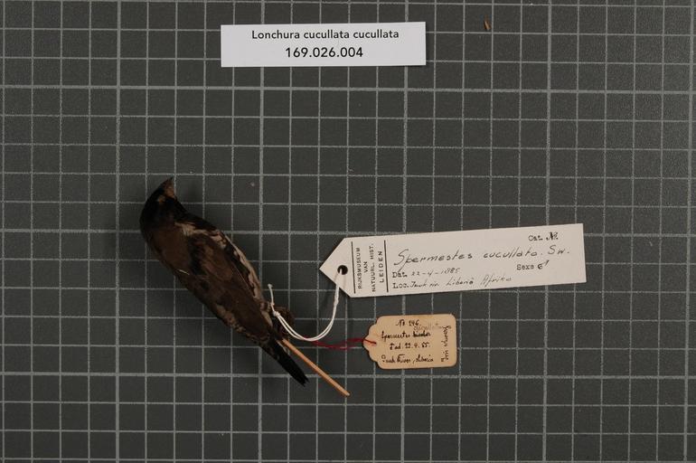 | Keywords: Naturalis Biodiversity Center - RMNH.AVES.160829 1 - Lonchura cucullata cucullata (Swainson, 1837) - Estrildidae - bird skin specimen.jpeg artwork Dimensions artwork Document type Estrildidae Lonchura Individual count 1 Infraspecific epithet cucullata Infraspecific rank Institution Naturalis Kind of unit artwork Kind of unit specimen skin Life stage Afrika Liberia Inuk river Medium artwork Nomenclatural code Occurrence ID page Other fields Other versions artwork Permission license Naturalis donation CC-0 Publication location Scientific name Lonchura cucullata cucullata Swainson 1837 Scientific name authorship Swainson 1837 male Source url http //bioportal naturalis nl Specific epithet cucullata State or province Subject keywords artwork Subject keywords publication Title artwork Title publication Type status Uploaded with GWToolset Naturalis_Biodiversity_Center_-_RMNH AVES 160829_1_-_Lonchura_cucullata_cucullata_ Swainson _1837 _-_Estrildidae_-_bird_skin_specimen http //medialib naturalis nl/file/id/RMNH AVES 160829_1/format/large Media donated by Naturalis Biodiversity Center Songbird specimens at Naturalis Biodiversity Center Lonchura cucullata Lonchura |