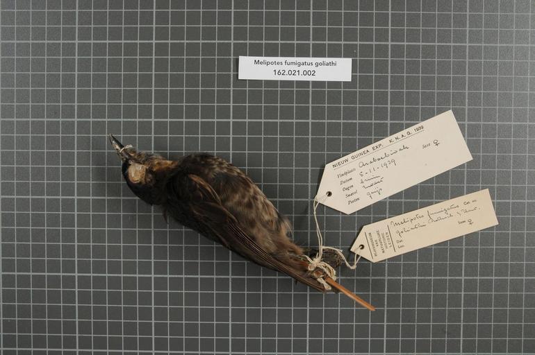 Keywords: Naturalis Biodiversity Center - RMNH.AVES.19140 1 - Melipotes fumigatus goliathi Rothschild and Hartert, 1911 - Meliphagidae - bird skin specimen.jpeg artwork Dimensions artwork Document type Meliphagidae Melipotes Individual count 1 Infraspecific epithet goliathi Infraspecific rank Institution Naturalis Kind of unit artwork Kind of unit specimen skin Life stage Araboebivak Medium artwork Nomenclatural code Occurrence ID page Other fields Other versions artwork Permission license Naturalis donation CC-0 Publication location Scientific name Melipotes fumigatus goliathi Rothschild and Hartert 1911 Scientific name authorship Rothschild and Hartert 1911 female Source url http //bioportal naturalis nl Specific epithet fumigatus State or province Subject keywords artwork Subject keywords publication Title artwork Title publication Type status Uploaded with GWToolset Naturalis_Biodiversity_Center_-_RMNH AVES 19140_1_-_Melipotes_fumigatus_goliathi_Rothschild_and_Hartert _1911_-_Meliphagidae_-_bird_skin_specimen http //medialib naturalis nl/file/id/RMNH AVES 19140_1/format/large Media donated by Naturalis Biodiversity Center Songbird specimens at Naturalis Biodiversity Center Melipotes fumigatus Melipotes |