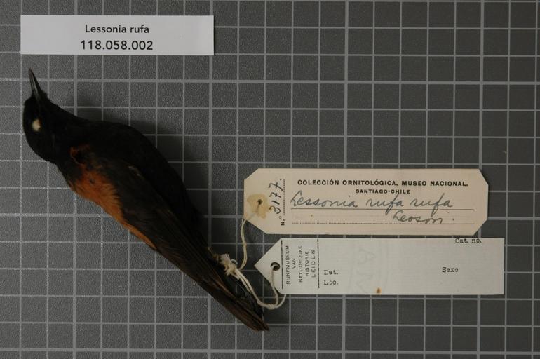Keywords: Naturalis Biodiversity Center - RMNH.AVES.20381 1 - Lessonia rufa (Gmelin, 1789) - Tyrannidae - bird skin specimen.jpeg artwork Dimensions artwork Document type Tyrannidae Lessonia Individual count 1 Infraspecific epithet Infraspecific rank Institution Naturalis Kind of unit artwork Kind of unit specimen skin Life stage adult Tierra del Fuego Ekewern Medium artwork Nomenclatural code Occurrence ID page Other fields Other versions artwork Permission license Naturalis donation CC-0 Publication location Scientific name Lessonia rufa Gmelin 1789 Scientific name authorship Gmelin 1789 male Source url http //bioportal naturalis nl Specific epithet rufa State or province Tierra del Fuego Subject keywords artwork Subject keywords publication Title artwork Title publication Type status Uploaded with GWToolset Naturalis_Biodiversity_Center_-_RMNH AVES 20381_1_-_Lessonia_rufa_ Gmelin _1789 _-_Tyrannidae_-_bird_skin_specimen http //medialib naturalis nl/file/id/RMNH AVES 20381_1/format/large Media donated by Naturalis Biodiversity Center Songbird specimens at Naturalis Biodiversity Center Lessonia rufa Lessonia