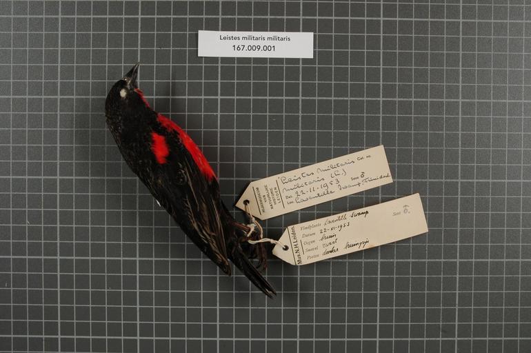 Keywords: Naturalis Biodiversity Center - RMNH.AVES.21597 1 - Leistes militaris militaris (Linnaeus, 1758) - Icteridae - bird skin specimen.jpeg artwork Dimensions artwork Document type Icteridae Leistes Individual count 1 Infraspecific epithet militaris Infraspecific rank Institution Naturalis Kind of unit artwork Kind of unit specimen skin Life stage Trinidad Laventille Swamp Medium artwork Nomenclatural code Occurrence ID page Other fields Other versions artwork Permission license Naturalis donation CC-0 Publication location Scientific name Leistes militaris militaris Linnaeus 1758 Scientific name authorship Linnaeus 1758 male Source url http //bioportal naturalis nl Specific epithet militaris State or province Subject keywords artwork Subject keywords publication Title artwork Title publication Type status Uploaded with GWToolset Naturalis_Biodiversity_Center_-_RMNH AVES 21597_1_-_Leistes_militaris_militaris_ Linnaeus _1758 _-_Icteridae_-_bird_skin_specimen http //medialib naturalis nl/file/id/RMNH AVES 21597_1/format/large Media donated by Naturalis Biodiversity Center Songbird specimens at Naturalis Biodiversity Center Sturnella militaris