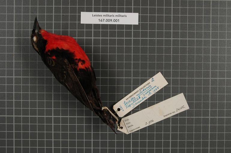 Keywords: Naturalis Biodiversity Center - RMNH.AVES.24105 1 - Leistes militaris militaris (Linnaeus, 1758) - Icteridae - bird skin specimen.jpeg artwork Dimensions artwork Document type Icteridae Leistes Individual count 1 Infraspecific epithet militaris Infraspecific rank Institution Naturalis Kind of unit artwork Kind of unit specimen skin Life stage Surinam Republiek Medium artwork Nomenclatural code Occurrence ID page Other fields Other versions artwork Permission license Naturalis donation CC-0 Publication location Scientific name Leistes militaris militaris Linnaeus 1758 Scientific name authorship Linnaeus 1758 male Source url http //bioportal naturalis nl Specific epithet militaris State or province Subject keywords artwork Subject keywords publication Title artwork Title publication Type status Uploaded with GWToolset Naturalis_Biodiversity_Center_-_RMNH AVES 24105_1_-_Leistes_militaris_militaris_ Linnaeus _1758 _-_Icteridae_-_bird_skin_specimen http //medialib naturalis nl/file/id/RMNH AVES 24105_1/format/large Media donated by Naturalis Biodiversity Center Songbird specimens at Naturalis Biodiversity Center Sturnella militaris