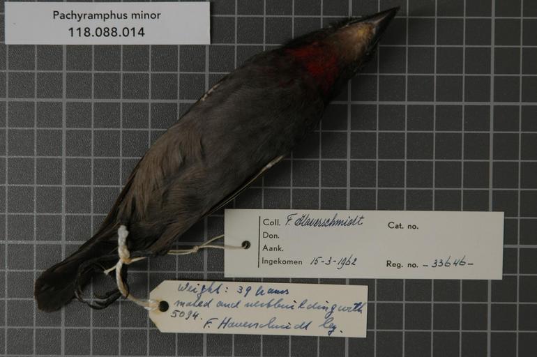 | Keywords: Naturalis Biodiversity Center - RMNH.AVES.33646 2 - Pachyramphus minor (Lesson, 1830) - Tyrannidae - bird skin specimen.jpeg artwork Dimensions artwork Document type Tyrannidae Pachyramphus Individual count 1 Infraspecific epithet Infraspecific rank Institution Naturalis Kind of unit artwork Kind of unit specimen skin Life stage Surinam Commenwijne Dist Moripocreek Medium artwork Nomenclatural code ADDITIONAL FAMILY INFO mated and nest building with 5094 Occurrence ID page Other fields Other versions artwork Permission license Naturalis donation CC-0 Publication location Scientific name Pachyramphus minor Lesson 1830 Scientific name authorship Lesson 1830 male Source url http //bioportal naturalis nl Specific epithet minor State or province Commenwijne Dist Subject keywords artwork Subject keywords publication Title artwork Title publication Type status Uploaded with GWToolset Naturalis_Biodiversity_Center_-_RMNH AVES 33646_2_-_Pachyramphus_minor_ Lesson _1830 _-_Tyrannidae_-_bird_skin_specimen http //medialib naturalis nl/file/id/RMNH AVES 33646_2/format/large Media donated by Naturalis Biodiversity Center Songbird specimens at Naturalis Biodiversity Center Pachyramphus minor Pachyramphus |