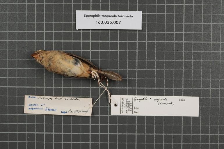 Keywords: Naturalis Biodiversity Center - RMNH.AVES.35079 2 - Sporophila torqueola torqueola (Bonaparte, 1851) - Emberizidae - bird skin specimen.jpeg artwork Dimensions artwork Document type Emberizidae Sporophila Individual count 1 Infraspecific epithet torqueola Infraspecific rank Institution Naturalis Kind of unit artwork Kind of unit specimen skin Life stage Oaxaca Loma Bonita Rancho Las Vegas Medium artwork Nomenclatural code Bodily condition Fett II Occurrence ID page Other fields Other versions artwork Permission license Naturalis donation CC-0 Publication location Scientific name Sporophila torqueola torqueola Bonaparte 1851 Scientific name authorship Bonaparte 1851 female Source url http //bioportal naturalis nl Specific epithet torqueola State or province Oaxaca Subject keywords artwork Subject keywords publication Title artwork Title publication Type status Uploaded with GWToolset Naturalis_Biodiversity_Center_-_RMNH AVES 35079_2_-_Sporophila_torqueola_torqueola_ Bonaparte _1851 _-_Emberizidae_-_bird_skin_specimen http //medialib naturalis nl/file/id/RMNH AVES 35079_2/format/large Media donated by Naturalis Biodiversity Center Songbird specimens at Naturalis Biodiversity Center Sporophila torqueola Sporophila