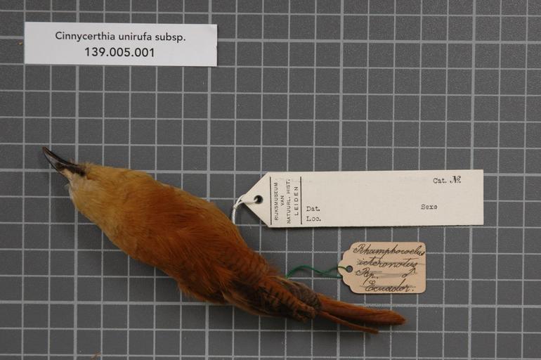 Keywords: Naturalis Biodiversity Center - RMNH.AVES.128603 1 - Cinnycerthia unirufa subsp. - Troglodytidae - bird skin specimen.jpeg artwork Dimensions artwork Document type Troglodytidae Cinnycerthia Individual count 1 Infraspecific epithet subsp Infraspecific rank Institution Naturalis Kind of unit artwork Kind of unit specimen skin Life stage Medium artwork Nomenclatural code Country remark Ecuador crossed out on original label Sex remark Crossed out on original label Occurrence ID page Other fields Other versions artwork Permission license Naturalis donation CC-0 Publication location Scientific name Cinnycerthia unirufa subsp Scientific name authorship male Source url http //bioportal naturalis nl Specific epithet unirufa State or province Subject keywords artwork Subject keywords publication Title artwork Title publication Type status Uploaded with GWToolset Naturalis_Biodiversity_Center_-_RMNH AVES 128603_1_-_Cinnycerthia_unirufa_subsp _-_Troglodytidae_-_bird_skin_specimen http //medialib naturalis nl/file/id/RMNH AVES 128603_1/format/large Media donated by Naturalis Biodiversity Center Songbird specimens at Naturalis Biodiversity Center Cinnycerthia unirufa Cinnycerthia |