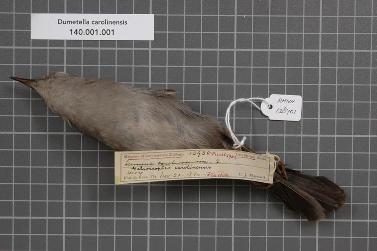 Keywords: Naturalis Biodiversity Center - RMNH.AVES.128701 1 - Dumetella carolinensis (Linnaeus, 1766) - Mimidae - bird skin specimen.jpeg artwork Dimensions artwork Document type Mimidae Dumetella Individual count 1 Infraspecific epithet Infraspecific rank Institution Naturalis Kind of unit artwork Kind of unit specimen skin Life stage Medium artwork Nomenclatural code Occurrence ID page Other fields Other versions artwork Permission license Naturalis donation CC-0 Publication location Scientific name Dumetella carolinensis Linnaeus 1766 Scientific name authorship Linnaeus 1766 female Source url http //bioportal naturalis nl Specific epithet carolinensis State or province Florida Florida Keys Subject keywords artwork Subject keywords publication Title artwork Title publication Type status Uploaded with GWToolset Naturalis_Biodiversity_Center_-_RMNH AVES 128701_1_-_Dumetella_carolinensis_ Linnaeus _1766 _-_Mimidae_-_bird_skin_specimen http //medialib naturalis nl/file/id/RMNH AVES 128701_1/format/large Media donated by Naturalis Biodiversity Center Songbird specimens at Naturalis Biodiversity Center Dumetella carolinensis Dumetella |