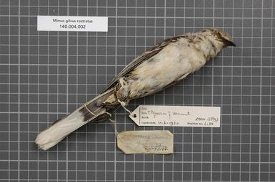 Keywords: Naturalis Biodiversity Center - RMNH.AVES.128737 2 - Mimus gilvus rostratus Ridgway, 1884 - Mimidae - bird skin specimen.jpeg artwork Dimensions artwork Document type Mimidae Mimus Individual count 1 Infraspecific epithet rostratus Infraspecific rank Institution Naturalis Kind of unit artwork Kind of unit specimen skin Life stage Medium artwork Nomenclatural code Region remark on small label Benedenwindsche-Eil Occurrence ID page Other fields Other versions artwork Permission license Naturalis donation CC-0 Publication location Scientific name Mimus gilvus rostratus Ridgway 1884 Scientific name authorship Ridgway 1884 Source url http //bioportal naturalis nl Specific epithet gilvus State or province Curaτao Subject keywords artwork Subject keywords publication Title artwork Title publication Type status Uploaded with GWToolset Naturalis_Biodiversity_Center_-_RMNH AVES 128737_2_-_Mimus_gilvus_rostratus_Ridgway _1884_-_Mimidae_-_bird_skin_specimen http //medialib naturalis nl/file/id/RMNH AVES 128737_2/format/large Media donated by Naturalis Biodiversity Center Songbird specimens at Naturalis Biodiversity Center Mimus gilvus museum specimens |