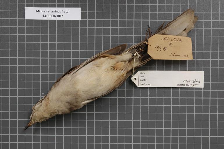 Keywords: Naturalis Biodiversity Center - RMNH.AVES.128743 2 - Mimus saturninus frater Hellmayr, 1903 - Mimidae - bird skin specimen.jpeg artwork Dimensions artwork Document type Mimidae Mimus Individual count 1 Infraspecific epithet frater Infraspecific rank Institution Naturalis Kind of unit artwork Kind of unit specimen skin Life stage juvenile Medium artwork Nomenclatural code Occurrence ID page Other fields Other versions artwork Permission license Naturalis donation CC-0 Publication location Scientific name Mimus saturninus frater Hellmayr 1903 Scientific name authorship Hellmayr 1903 male Source url http //bioportal naturalis nl Specific epithet saturninus State or province Subject keywords artwork Subject keywords publication Title artwork Title publication Type status Uploaded with GWToolset Naturalis_Biodiversity_Center_-_RMNH AVES 128743_2_-_Mimus_saturninus_frater_Hellmayr _1903_-_Mimidae_-_bird_skin_specimen http //medialib naturalis nl/file/id/RMNH AVES 128743_2/format/large Media donated by Naturalis Biodiversity Center Songbird specimens at Naturalis Biodiversity Center Mimus saturninus museum specimens |