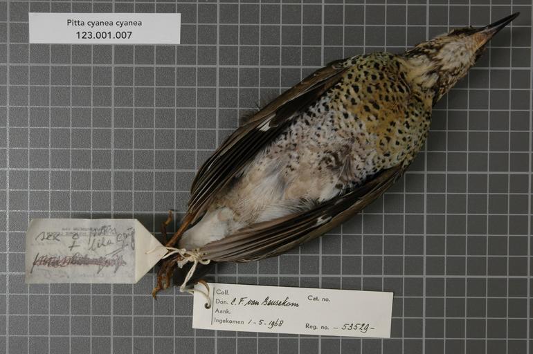 Keywords: Naturalis Biodiversity Center - RMNH.AVES.53529 2 - Pitta cyanea cyanea Blyth, 1843 - Pittidae - bird skin specimen.jpeg artwork Dimensions artwork Document type Pittidae Pitta Individual count 1 Infraspecific epithet cyanea Infraspecific rank Institution Naturalis Kind of unit artwork Kind of unit specimen skin Life stage Thailand Kanchanaburi Khao Yai near river Kwai Medium artwork Nomenclatural code Occurrence ID page Other fields Other versions artwork Permission license Naturalis donation CC-0 Publication location Scientific name Pitta cyanea cyanea Blyth 1843 Scientific name authorship Blyth 1843 female Source url http //bioportal naturalis nl Specific epithet cyanea State or province Kanchanaburi Subject keywords artwork Subject keywords publication Title artwork Title publication Type status Uploaded with GWToolset Naturalis_Biodiversity_Center_-_RMNH AVES 53529_2_-_Pitta_cyanea_cyanea_Blyth _1843_-_Pittidae_-_bird_skin_specimen http //medialib naturalis nl/file/id/RMNH AVES 53529_2/format/large Media donated by Naturalis Biodiversity Center Songbird specimens at Naturalis Biodiversity Center Pitta cyanea Pitta |
