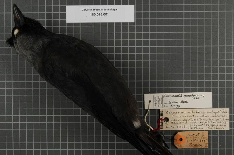 | Keywords: Naturalis Biodiversity Center - RMNH.AVES.56318 1 - Corvus monedula spermologus Vieillot, 1817 - Corvidae - bird skin specimen.jpeg artwork Dimensions artwork Document type Corvidae Corvus Individual count 1 Infraspecific epithet spermologus Infraspecific rank Institution Naturalis Kind of unit artwork Kind of unit specimen skin Life stage Netherlands Limburg Heerlen Ter Worm Medium artwork Nomenclatural code Bodily condition Broedvlek doch nog niet geZwollen ADDITIONAL preparation info P Hens Occurrence ID page Other fields Other versions artwork Permission license Naturalis donation CC-0 Publication location Scientific name Corvus monedula spermologus Vieillot 1817 Scientific name authorship Vieillot 1817 female Source url http //bioportal naturalis nl Specific epithet monedula State or province Limburg Subject keywords artwork Subject keywords publication Title artwork Title publication Type status Uploaded with GWToolset Naturalis_Biodiversity_Center_-_RMNH AVES 56318_1_-_Corvus_monedula_spermologus_Vieillot _1817_-_Corvidae_-_bird_skin_specimen http //medialib naturalis nl/file/id/RMNH AVES 56318_1/format/large Media donated by Naturalis Biodiversity Center Songbird specimens at Naturalis Biodiversity Center Coloeus monedula Corvus |