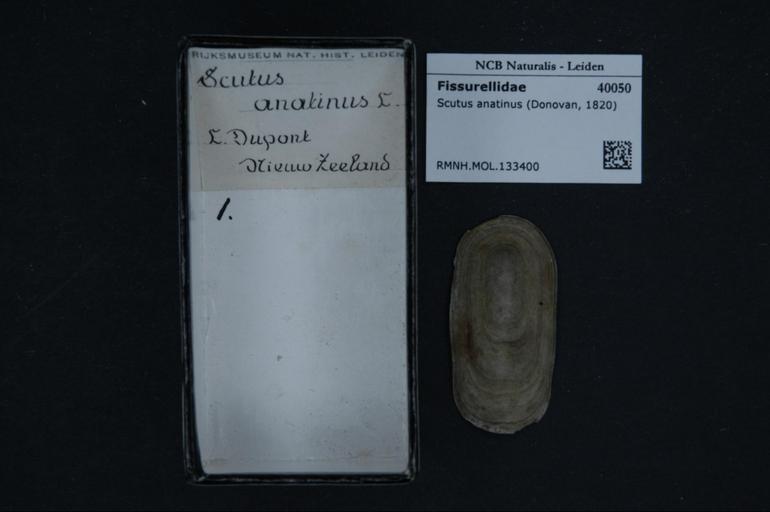 | Keywords: Naturalis Biodiversity Center - RMNH.MOL.133400 - Scutus anatinus (Donovan, 1820) - Fissurellidae - Mollusc shell.jpeg artwork Dimensions artwork Document type Fissurellidae subfamily Emarginulinae Scutus Individual count Infraspecific epithet Infraspecific rank Institution Naturalis Kind of unit artwork Kind of unit specimen shell Life stage Medium artwork Nomenclatural code Source institute Leiden Scale the width of the text on the species/QR-code label is 38 mm Occurrence ID page Other fields Other versions artwork Permission license Naturalis donation CC-0 Mollusca Publication location Scientific name Scutus anatinus Donovan 1820 Scientific name authorship Donovan 1820 Source url http //bioportal naturalis nl Specific epithet anatinus State or province Subject keywords artwork Subject keywords publication Title artwork Title publication Type status Uploaded with GWToolset Naturalis_Biodiversity_Center_-_RMNH MOL 133400_-_Scutus_anatinus_ Donovan _1820 _-_Fissurellidae_-_Mollusc_shell http //medialib naturalis nl/file/id/RMNH MOL 133400/format/large Molluscs at Naturalis from the Rijksmuseum van Natuurlijke Historie Media donated by Naturalis Biodiversity Center Scutus Scutus anatinus |