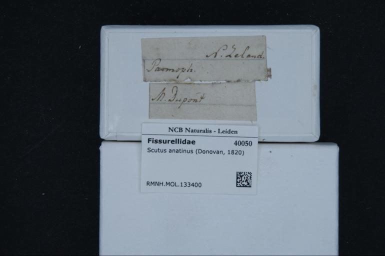 Keywords: Naturalis Biodiversity Center - RMNH.MOL.133400 1 - Scutus anatinus (Donovan, 1820) - Fissurellidae - Mollusc shell.jpeg artwork Dimensions artwork Document type Fissurellidae subfamily Emarginulinae Scutus Individual count Infraspecific epithet Infraspecific rank Institution Naturalis Kind of unit artwork Kind of unit specimen shell Life stage Medium artwork Nomenclatural code Source institute Leiden Scale the width of the text on the species/QR-code label is 38 mm Occurrence ID page Other fields Other versions artwork Permission license Naturalis donation CC-0 Mollusca Publication location Scientific name Scutus anatinus Donovan 1820 Scientific name authorship Donovan 1820 Source url http //bioportal naturalis nl Specific epithet anatinus State or province Subject keywords artwork Subject keywords publication Title artwork Title publication Type status Uploaded with GWToolset Naturalis_Biodiversity_Center_-_RMNH MOL 133400_1_-_Scutus_anatinus_ Donovan _1820 _-_Fissurellidae_-_Mollusc_shell http //medialib naturalis nl/file/id/RMNH MOL 133400_1/format/large Molluscs at Naturalis from the Rijksmuseum van Natuurlijke Historie Media donated by Naturalis Biodiversity Center Scutus Scutus anatinus