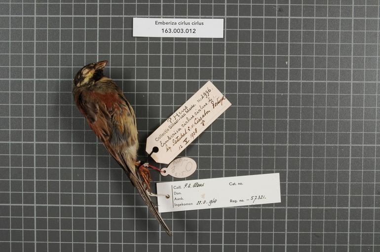 | Keywords: Naturalis Biodiversity Center - RMNH.AVES.57321 1 - Emberiza cirlus cirlus Linnaeus, 1766 - Emberizidae - bird skin specimen.jpeg artwork Dimensions artwork Document type Emberizidae Emberiza Individual count 1 Infraspecific epithet cirlus Infraspecific rank Institution Naturalis Kind of unit artwork Kind of unit specimen skin Life stage Portugal Z v Lissabon bij Setubal Medium artwork Nomenclatural code Occurrence ID page Other fields Other versions artwork Permission license Naturalis donation CC-0 Publication location Scientific name Emberiza cirlus cirlus Linnaeus 1766 Scientific name authorship Linnaeus 1766 male Source url http //bioportal naturalis nl Specific epithet cirlus State or province Subject keywords artwork Subject keywords publication Title artwork Title publication Type status Uploaded with GWToolset Naturalis_Biodiversity_Center_-_RMNH AVES 57321_1_-_Emberiza_cirlus_cirlus_Linnaeus _1766_-_Emberizidae_-_bird_skin_specimen http //medialib naturalis nl/file/id/RMNH AVES 57321_1/format/large Media donated by Naturalis Biodiversity Center Songbird specimens at Naturalis Biodiversity Center Emberiza cirlus Emberiza |