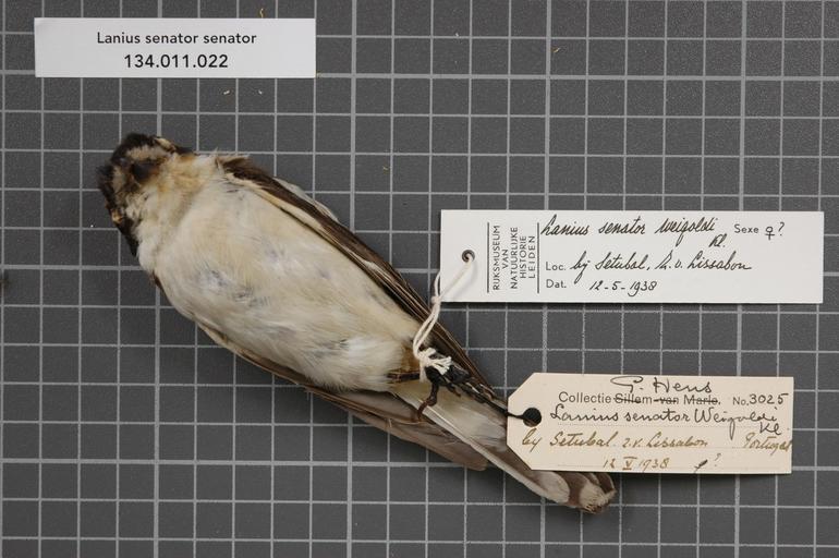 | Keywords: Naturalis Biodiversity Center - RMNH.AVES.58018 1 - Lanius senator senator Linnaeus, 1758 - Laniidae - bird skin specimen.jpeg artwork Dimensions artwork Document type Laniidae Lanius Individual count 1 Infraspecific epithet senator Infraspecific rank Institution Naturalis Kind of unit artwork Kind of unit specimen skin Life stage Portugal bij Setubal Z van Lissabon Medium artwork Nomenclatural code Sex remark On Hens label 'female' Occurrence ID page Other fields Other versions artwork Permission license Naturalis donation CC-0 Publication location Scientific name Lanius senator senator Linnaeus 1758 Scientific name authorship Linnaeus 1758 female Source url http //bioportal naturalis nl Specific epithet senator State or province Subject keywords artwork Subject keywords publication Title artwork Title publication Type status Uploaded with GWToolset Naturalis_Biodiversity_Center_-_RMNH AVES 58018_1_-_Lanius_senator_senator_Linnaeus _1758_-_Laniidae_-_bird_skin_specimen http //medialib naturalis nl/file/id/RMNH AVES 58018_1/format/large Media donated by Naturalis Biodiversity Center Songbird specimens at Naturalis Biodiversity Center Lanius senator Lanius |