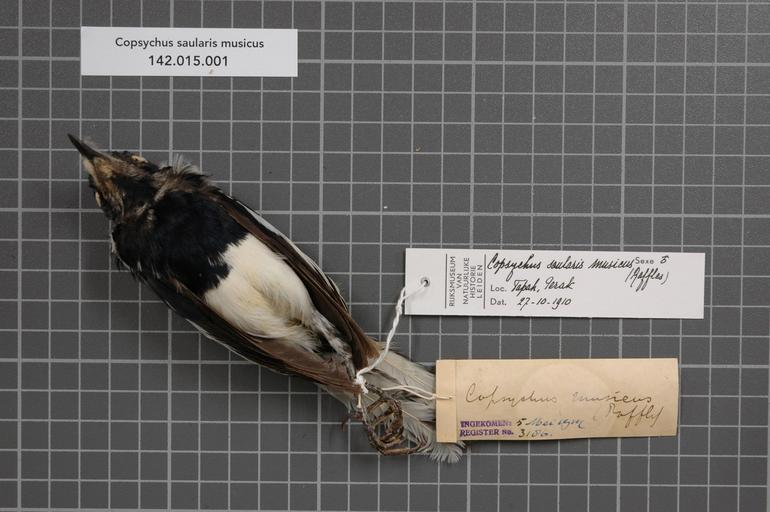 Keywords: Naturalis Biodiversity Center - RMNH.AVES.129306 1 - Copsychus saularis musicus (Raffles, 1822) - Turdidae - bird skin specimen.jpeg artwork Dimensions artwork Document type Turdidae Copsychus Individual count 1 Infraspecific epithet musicus Infraspecific rank Institution Naturalis Kind of unit artwork Kind of unit specimen skin Life stage Medium artwork Nomenclatural code Bodily condition Hoden pigm Occurrence ID page Other fields Other versions artwork Permission license Naturalis donation CC-0 Publication location Scientific name Copsychus saularis musicus Raffles 1822 Scientific name authorship Raffles 1822 male Source url http //bioportal naturalis nl Specific epithet saularis State or province Perak Subject keywords artwork Subject keywords publication Title artwork Title publication Type status Uploaded with GWToolset Naturalis_Biodiversity_Center_-_RMNH AVES 129306_1_-_Copsychus_saularis_musicus_ Raffles _1822 _-_Turdidae_-_bird_skin_specimen http //medialib naturalis nl/file/id/RMNH AVES 129306_1/format/large Media donated by Naturalis Biodiversity Center Songbird specimens at Naturalis Biodiversity Center Copsychus saularis museum specimens |