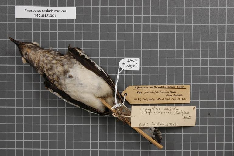 Keywords: Naturalis Biodiversity Center - RMNH.AVES.129316 1 - Copsychus saularis musicus (Raffles, 1822) - Turdidae - bird skin specimen.jpeg artwork Dimensions artwork Document type Turdidae Copsychus Individual count 1 Infraspecific epithet musicus Infraspecific rank Institution Naturalis Kind of unit artwork Kind of unit specimen skin Life stage juvenile Medium artwork Nomenclatural code Sex remark On fieldlabel male Occurrence ID page Other fields Other versions artwork Permission license Naturalis donation CC-0 Publication location Scientific name Copsychus saularis musicus Raffles 1822 Scientific name authorship Raffles 1822 male Source url http //bioportal naturalis nl Specific epithet saularis State or province Sumatra Pad Bovenlanden Subject keywords artwork Subject keywords publication Title artwork Title publication Type status Uploaded with GWToolset Naturalis_Biodiversity_Center_-_RMNH AVES 129316_1_-_Copsychus_saularis_musicus_ Raffles _1822 _-_Turdidae_-_bird_skin_specimen http //medialib naturalis nl/file/id/RMNH AVES 129316_1/format/large Media donated by Naturalis Biodiversity Center Songbird specimens at Naturalis Biodiversity Center Copsychus saularis museum specimens |