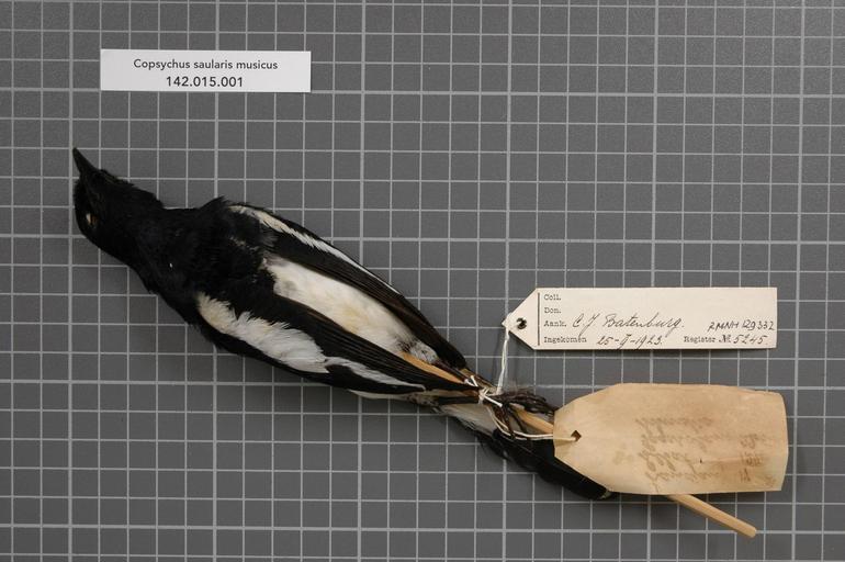 Keywords: Naturalis Biodiversity Center - RMNH.AVES.129332 2 - Copsychus saularis musicus (Raffles, 1822) - Turdidae - bird skin specimen.jpeg artwork Dimensions artwork Document type Turdidae Copsychus Individual count 1 Infraspecific epithet musicus Infraspecific rank Institution Naturalis Kind of unit artwork Kind of unit specimen skin Life stage Medium artwork Nomenclatural code Occurrence ID page Other fields Other versions artwork Permission license Naturalis donation CC-0 Publication location Scientific name Copsychus saularis musicus Raffles 1822 Scientific name authorship Raffles 1822 male Source url http //bioportal naturalis nl Specific epithet saularis State or province Sumatra Res Palembang Subject keywords artwork Subject keywords publication Title artwork Title publication Type status Uploaded with GWToolset Naturalis_Biodiversity_Center_-_RMNH AVES 129332_2_-_Copsychus_saularis_musicus_ Raffles _1822 _-_Turdidae_-_bird_skin_specimen http //medialib naturalis nl/file/id/RMNH AVES 129332_2/format/large Media donated by Naturalis Biodiversity Center Songbird specimens at Naturalis Biodiversity Center Copsychus saularis museum specimens |