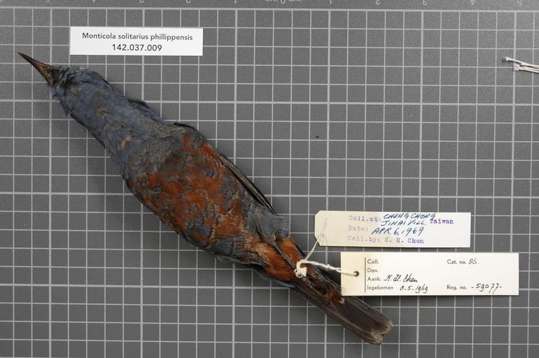 | Keywords: Naturalis Biodiversity Center - RMNH.AVES.59077 2- - Monticola solitarius philippensis (Muller, 1776) - Turdidae - bird skin specimen.jpeg artwork Dimensions artwork Document type Turdidae Monticola Individual count 1 Infraspecific epithet philippensis Infraspecific rank Institution Naturalis Kind of unit artwork Kind of unit specimen skin Life stage Taiwan Chung Cheng Jinai Vill Medium artwork Nomenclatural code General remarks Incorrectly spelled taxonname on boxlabel in left upper corner Monticola solitarius phillippensis 14037 009Chen label also contains Chinese/Taiwanese chracters Country remark On RMNH label Taiwan Formosa Occurrence ID page Other fields Other versions artwork Permission license Naturalis donation CC-0 Publication location Scientific name Monticola solitarius philippensis Muller 1776 Scientific name authorship Muller 1776 male Source url http //bioportal naturalis nl Specific epithet solitarius State or province Subject keywords artwork Subject keywords publication Title artwork Title publication Type status Uploaded with GWToolset Naturalis_Biodiversity_Center_-_RMNH AVES 59077_2 _-_Monticola_solitarius_philippensis_ Muller _1776 _-_Turdidae_-_bird_skin_specimen http //medialib naturalis nl/file/id/RMNH AVES 59077_2/format/large Media donated by Naturalis Biodiversity Center Songbird specimens at Naturalis Biodiversity Center Monticola solitarius philippensis museum specimens |
