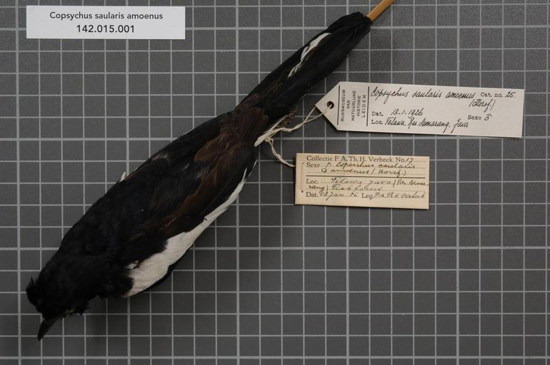 Keywords: Naturalis Biodiversity Center - RMNH.AVES.129424 1 - Copsychus saularis amoenus (Horsfield, 1821) - Turdidae - bird skin specimen.jpeg artwork Dimensions artwork Document type Turdidae Copsychus Individual count 1 Infraspecific epithet amoenus Infraspecific rank Institution Naturalis Kind of unit artwork Kind of unit specimen skin Life stage Medium artwork Nomenclatural code Occurrence ID page Other fields Other versions artwork Permission license Naturalis donation CC-0 Publication location Scientific name Copsychus saularis amoenus Horsfield 1821 Scientific name authorship Horsfield 1821 male Source url http //bioportal naturalis nl Specific epithet saularis State or province Java Res Semarang Subject keywords artwork Subject keywords publication Title artwork Title publication Type status Uploaded with GWToolset Naturalis_Biodiversity_Center_-_RMNH AVES 129424_1_-_Copsychus_saularis_amoenus_ Horsfield _1821 _-_Turdidae_-_bird_skin_specimen http //medialib naturalis nl/file/id/RMNH AVES 129424_1/format/large Media donated by Naturalis Biodiversity Center Songbird specimens at Naturalis Biodiversity Center Copsychus saularis museum specimens |