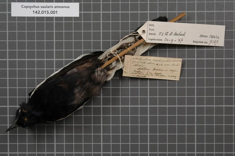 Keywords: Naturalis Biodiversity Center - RMNH.AVES.129424 2 - Copsychus saularis amoenus (Horsfield, 1821) - Turdidae - bird skin specimen.jpeg artwork Dimensions artwork Document type Turdidae Copsychus Individual count 1 Infraspecific epithet amoenus Infraspecific rank Institution Naturalis Kind of unit artwork Kind of unit specimen skin Life stage Medium artwork Nomenclatural code Occurrence ID page Other fields Other versions artwork Permission license Naturalis donation CC-0 Publication location Scientific name Copsychus saularis amoenus Horsfield 1821 Scientific name authorship Horsfield 1821 male Source url http //bioportal naturalis nl Specific epithet saularis State or province Java Res Semarang Subject keywords artwork Subject keywords publication Title artwork Title publication Type status Uploaded with GWToolset Naturalis_Biodiversity_Center_-_RMNH AVES 129424_2_-_Copsychus_saularis_amoenus_ Horsfield _1821 _-_Turdidae_-_bird_skin_specimen http //medialib naturalis nl/file/id/RMNH AVES 129424_2/format/large Media donated by Naturalis Biodiversity Center Songbird specimens at Naturalis Biodiversity Center Copsychus saularis museum specimens |