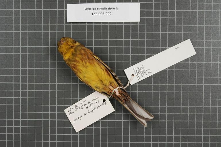Keywords: Naturalis Biodiversity Center - RMNH.AVES.61260 2 - Emberiza citrinella citrinella Linnaeus, 1758 - Emberizidae - bird skin specimen.jpeg artwork Dimensions artwork Document type Emberizidae Emberiza Individual count 1 Infraspecific epithet citrinella Infraspecific rank Institution Naturalis Kind of unit artwork Kind of unit specimen skin Life stage Overijsel Hattem Medium artwork Nomenclatural code ADDITIONAL preparation info praep W Engels Zwolle Occurrence ID page Other fields Other versions artwork Permission license Naturalis donation CC-0 Publication location Scientific name Emberiza citrinella citrinella Linnaeus 1758 Scientific name authorship Linnaeus 1758 male Source url http //bioportal naturalis nl Specific epithet citrinella State or province Overijsel Subject keywords artwork Subject keywords publication Title artwork Title publication Type status Uploaded with GWToolset Naturalis_Biodiversity_Center_-_RMNH AVES 61260_2_-_Emberiza_citrinella_citrinella_Linnaeus _1758_-_Emberizidae_-_bird_skin_specimen http //medialib naturalis nl/file/id/RMNH AVES 61260_2/format/large Media donated by Naturalis Biodiversity Center Songbird specimens at Naturalis Biodiversity Center Emberiza citrinella Emberiza |