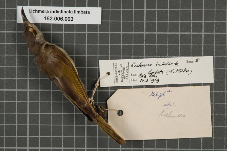 | Keywords: Naturalis Biodiversity Center - RMNH.AVES.65547 1 - Lichmera indistincta limbata (S. Muller, 1843) - Meliphagidae - bird skin specimen.jpeg artwork Dimensions artwork Document type Meliphagidae Lichmera Individual count 1 Infraspecific epithet limbata Infraspecific rank Institution Naturalis Kind of unit artwork Kind of unit specimen skin Life stage Roti Ba'a Medium artwork Nomenclatural code ADDITIONAL info XX Occurrence ID page Other fields Other versions artwork Permission license Naturalis donation CC-0 Publication location Scientific name Lichmera indistincta limbata S Muller 1843 Scientific name authorship S Müller 1843 male Source url http //bioportal naturalis nl Specific epithet indistincta State or province Roti Subject keywords artwork Subject keywords publication Title artwork Title publication Type status Uploaded with GWToolset Naturalis_Biodiversity_Center_-_RMNH AVES 65547_1_-_Lichmera_indistincta_limbata_ S _Muller _1843 _-_Meliphagidae_-_bird_skin_specimen http //medialib naturalis nl/file/id/RMNH AVES 65547_1/format/large Media donated by Naturalis Biodiversity Center Songbird specimens at Naturalis Biodiversity Center Lichmera indistincta Lichmera |