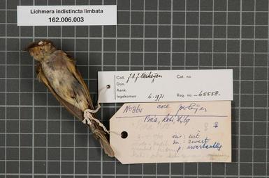 | Keywords: Naturalis Biodiversity Center - RMNH.AVES.65558 2 - Lichmera indistincta limbata (S. Muller, 1843) - Meliphagidae - bird skin specimen.jpeg artwork Dimensions artwork Document type Meliphagidae Lichmera Individual count 1 Infraspecific epithet limbata Infraspecific rank Institution Naturalis Kind of unit artwork Kind of unit specimen skin Life stage Roti Ba'a Medium artwork Nomenclatural code Occurrence ID page Other fields Other versions artwork Permission license Naturalis donation CC-0 Publication location Scientific name Lichmera indistincta limbata S Muller 1843 Scientific name authorship S Müller 1843 female Source url http //bioportal naturalis nl Specific epithet indistincta State or province Roti Subject keywords artwork Subject keywords publication Title artwork Title publication Type status Uploaded with GWToolset Naturalis_Biodiversity_Center_-_RMNH AVES 65558_2_-_Lichmera_indistincta_limbata_ S _Muller _1843 _-_Meliphagidae_-_bird_skin_specimen http //medialib naturalis nl/file/id/RMNH AVES 65558_2/format/large Media donated by Naturalis Biodiversity Center Songbird specimens at Naturalis Biodiversity Center Lichmera indistincta Lichmera |